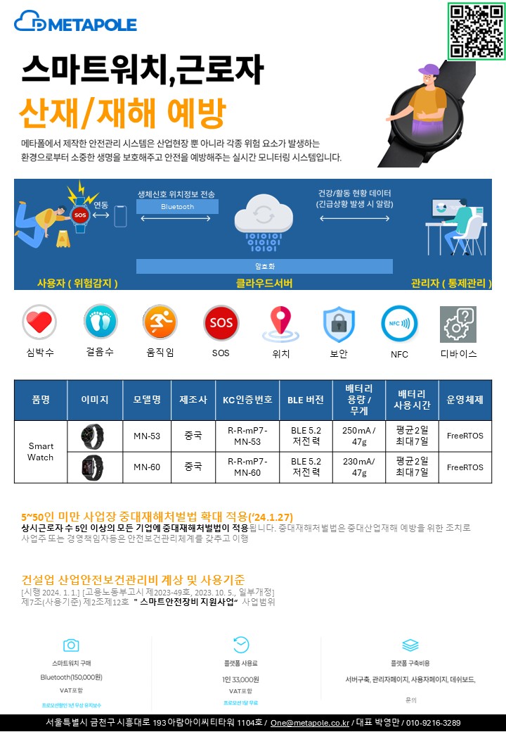 안전은 예방으로부터, 생명은 기술로부터! (주)메타폴에서 산업현장의 안전 사각지대를 해소하고 소중한 생명을 보호하기 위한 **[스마트워치 근로자 안전관리 솔루션]**을 선보입니다.